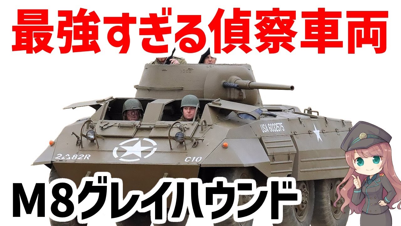 アメリカ軍がWW2で使用した6輪装甲車・M8グレイハウンドについての動画です。グレイハウンドという名前はイギリス軍で使用された名前で、アメリカ軍では使用されませんでした。グレイハウンドとは犬種の1つで、犬の中で最も速い犬です。M8もグレイハウンドのようにとても速い装甲車だったので、グレイハウンドの名前が付きました。M8はその快速性を活かし、偵察任務で活躍します。速いだけでなく、とても静かだったので、敵に気づかれずに行動することができました。概ね活躍し、好評を得ますが、防御力の低さは低評価でした。装甲は薄く、砲塔に屋根がないため、手榴弾や地雷で簡単にやられてしまいます。攻撃力も低かったです。